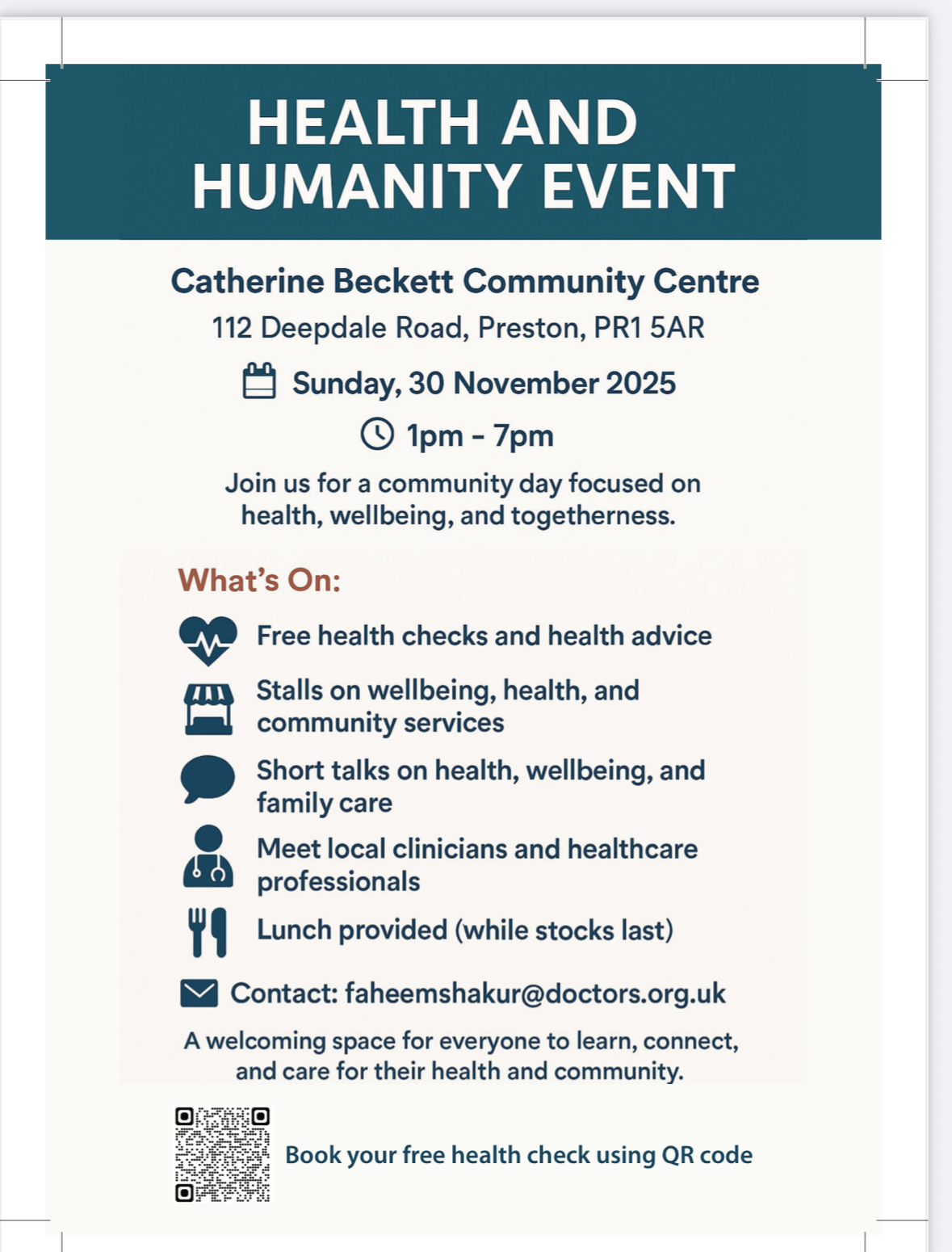 Home Events Health and Humanity Event Health and Humanity Event Workload Transfer 30Nov From: Sun 30th Nov 2025 @ 01:00 pm Until: 07:00 pm Contact Email: faheemshakur@doctors.org.uk Category: Non LMC Training Events + Google Calendar Please find flyer here with more details. Share this event on social media Twitter LinkedIn Pinterest Facebook Prev Event View All Events Next Event